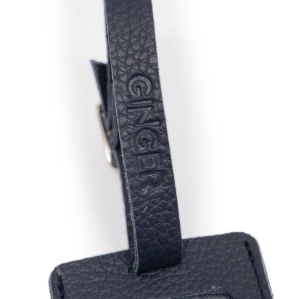 Luggage tag with silver buckle.